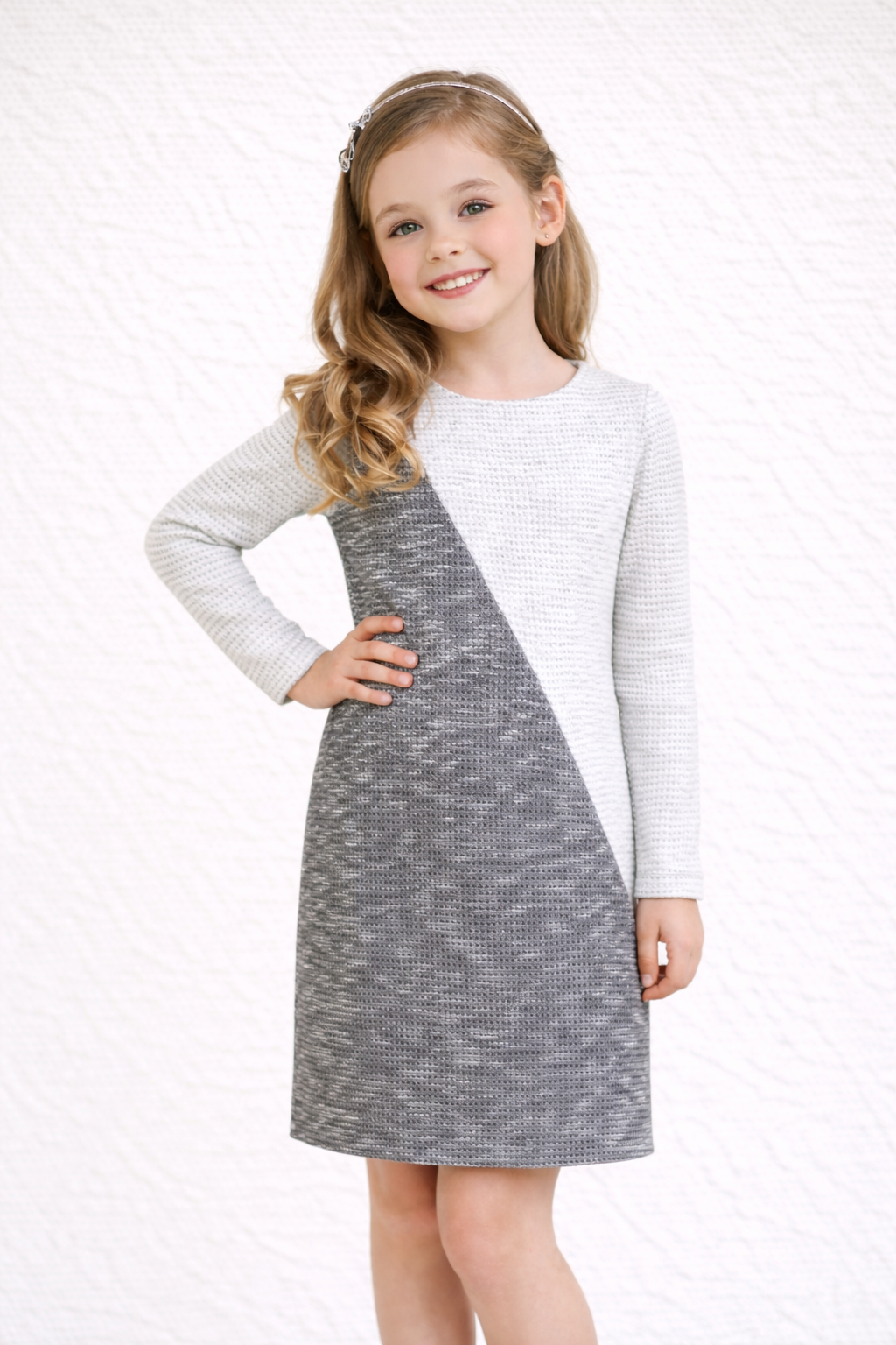 Dziewczęca sukienka o ciepłej, skośnej linii kroju łączy wygodę z modnym designem, idealna na chłodniejsze dni i wyjątkowe okazje.
