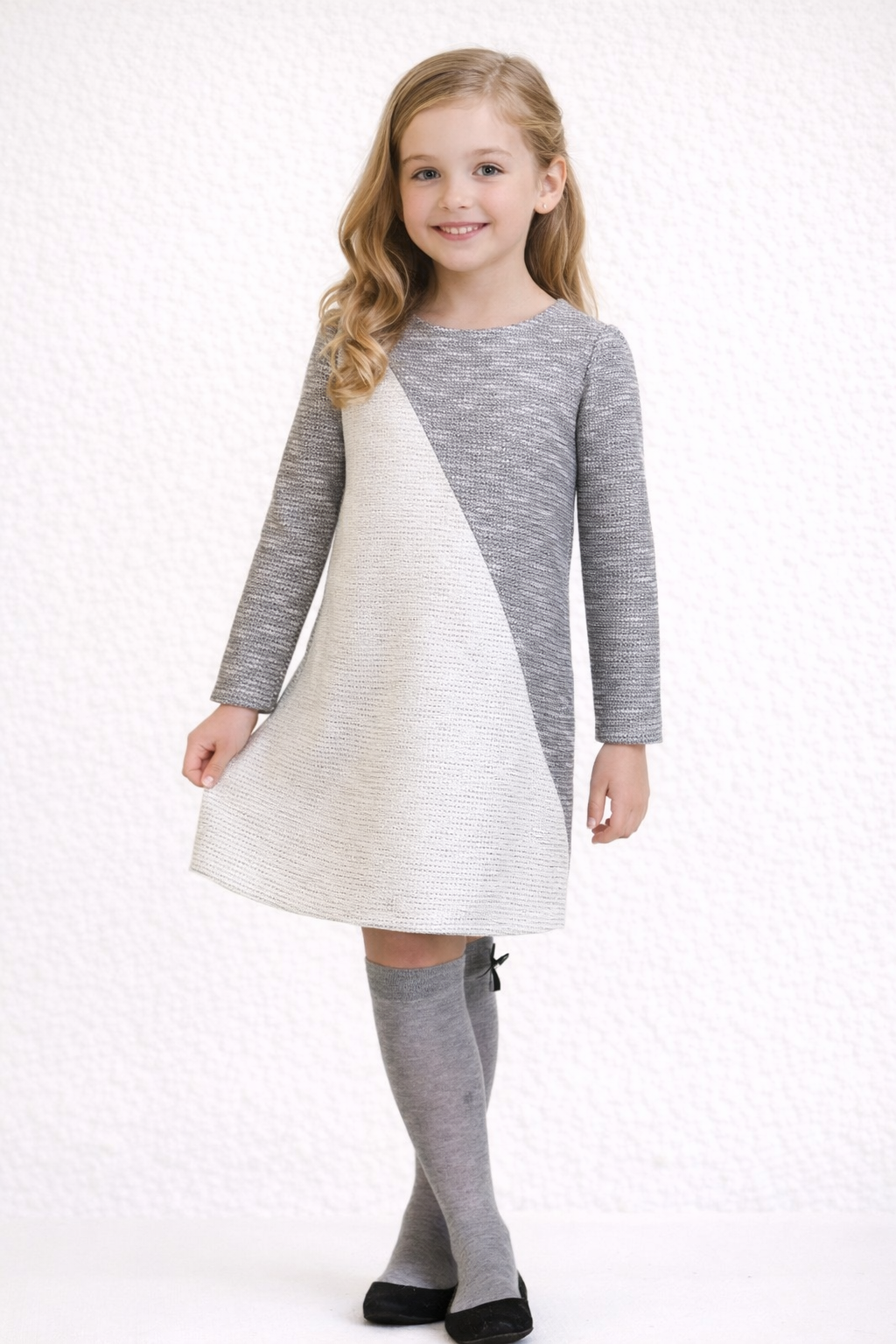 Dziewczęca sukienka o ciepłej, skośnej linii kroju łączy wygodę z modnym designem, idealna na chłodniejsze dni i wyjątkowe okazje.