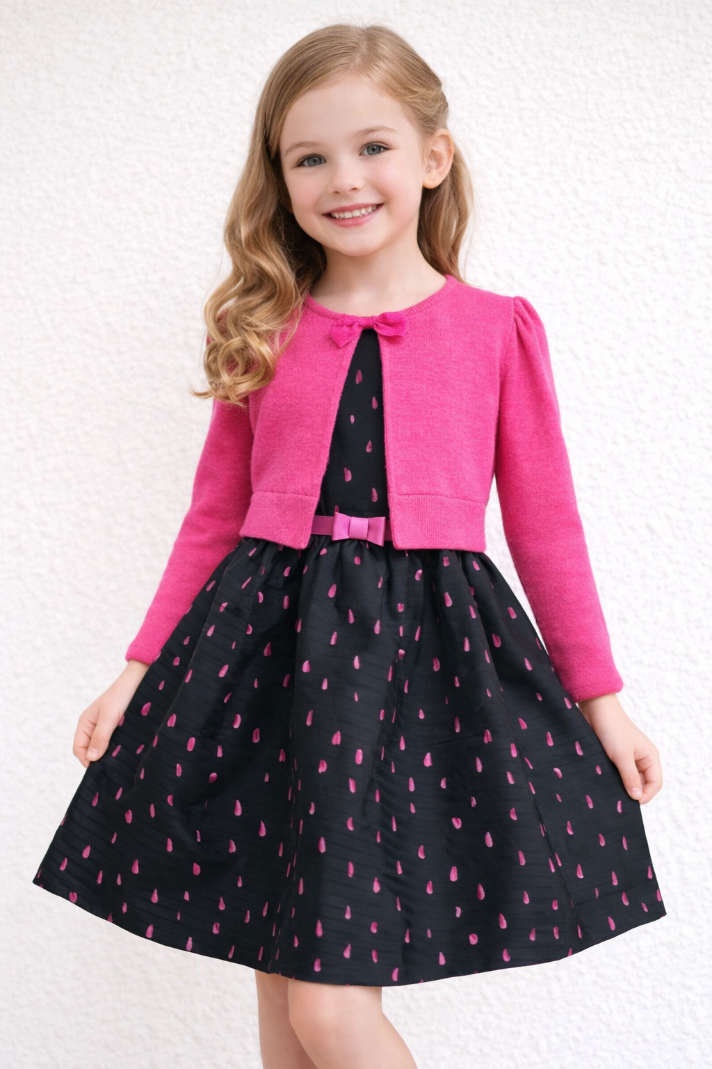 Dziewczęca sukienka z efektownym wzorem w kształcie łezki i dopasowanym bolerkiem, idealna na uroczyste okazje. Komfortowy krój oraz staranne wykończenie zapewniają wygodę noszenia przez cały dzień.